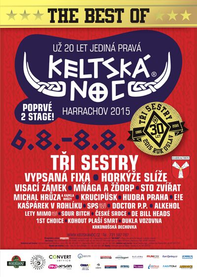 Letošní festival Keltská noc 2015 se bude skládat ze tří festivalových dní: čtvrtku 6.8.2015, pátku 7.8.2015 a soboty 8.8.2015. Změna programu vyhrazena. Vše se odehrává na dvou scénách v areálu skokanských můstků v Harrachově: